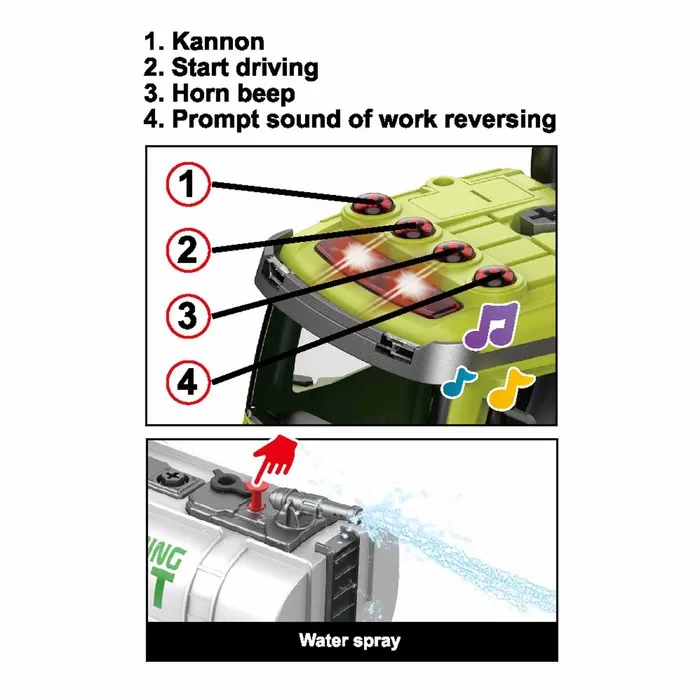 - Звуковые эффекты: воспроизводит звуки сигнала, работающего мотора, звук сирены и заднего хода.