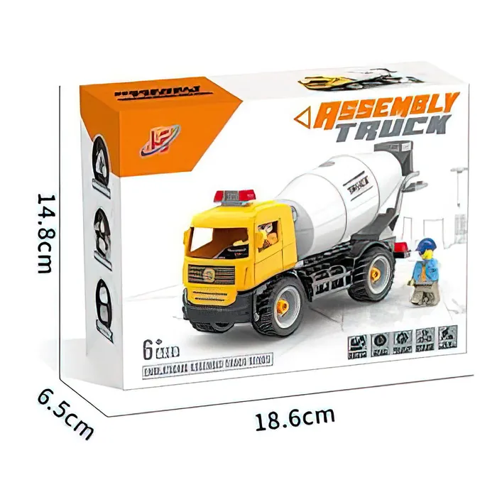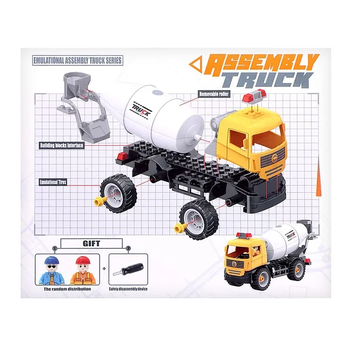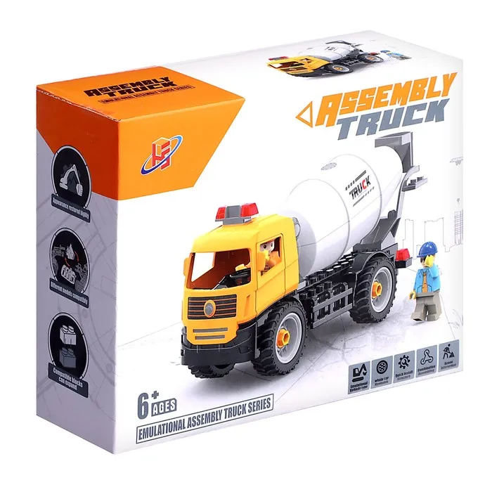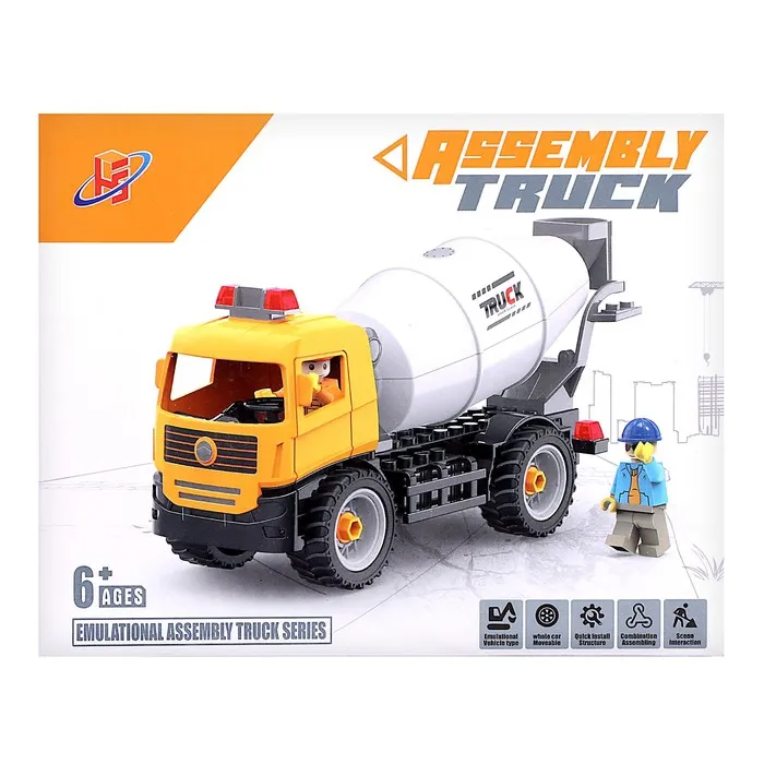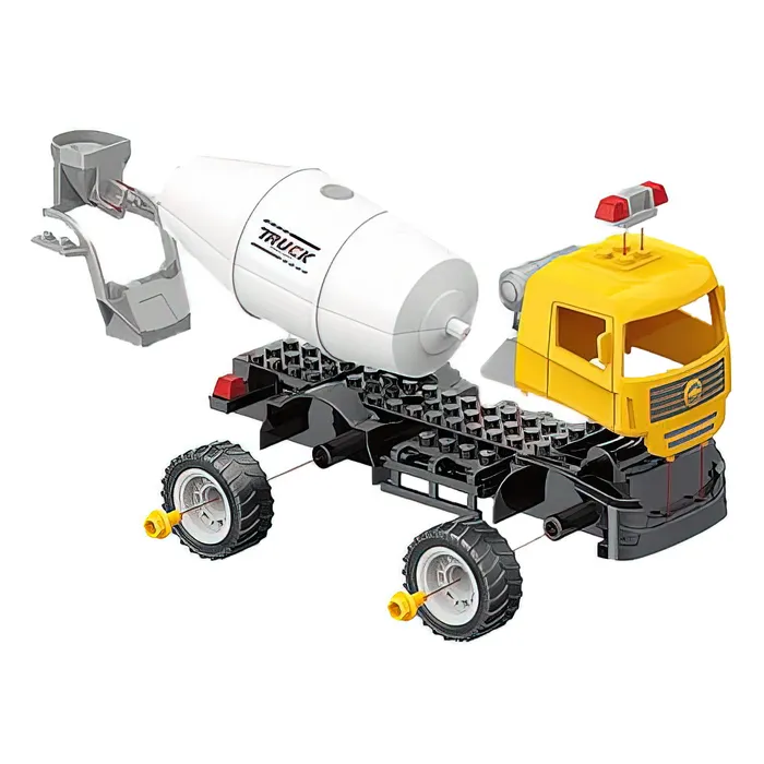 - Простота и функциональность: Детали легко соединяются, обеспечивая прочность конструкции. Модель бетономешалки не только выглядит реалистично, но и имитирует работу настоящей техники.