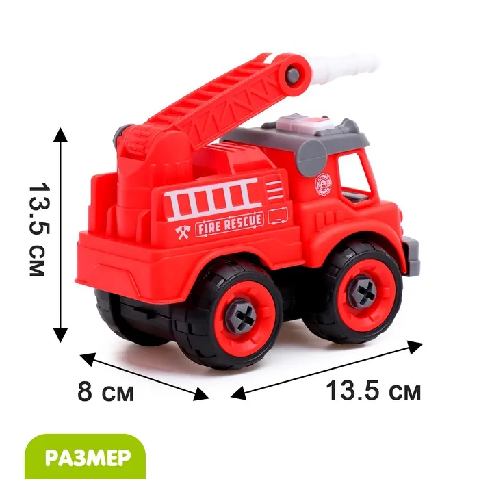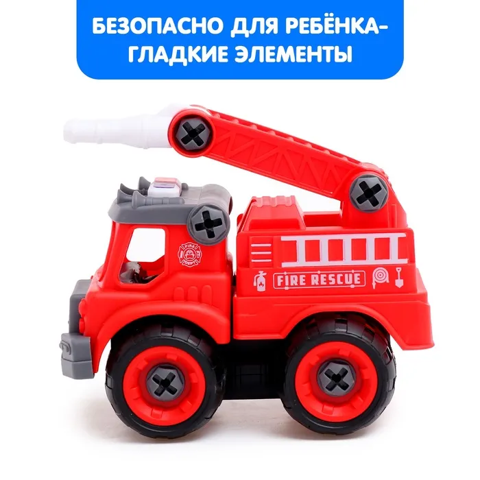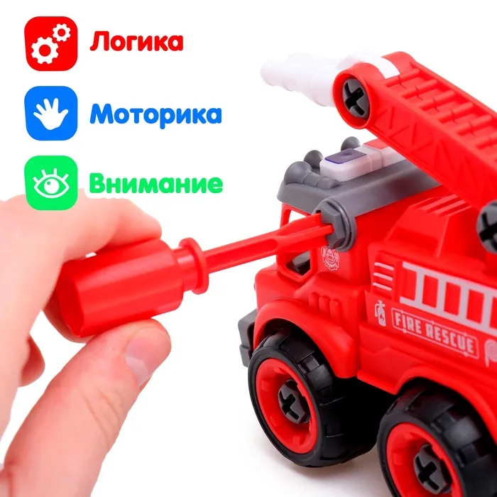 Винтовой конструктор «Пожарная машина» — это увлекательная яркая игрушка, которая обязательно порадует ребёнка! Ведь малыш самостоятельно соберёт её с помощью инструментов, имеющихся в наборе. Ребёнок получит необходимые бытовые знания, научится закручивать шурупы, болты, шестерёнки, пуговки, а также придумывать новые конструкции.