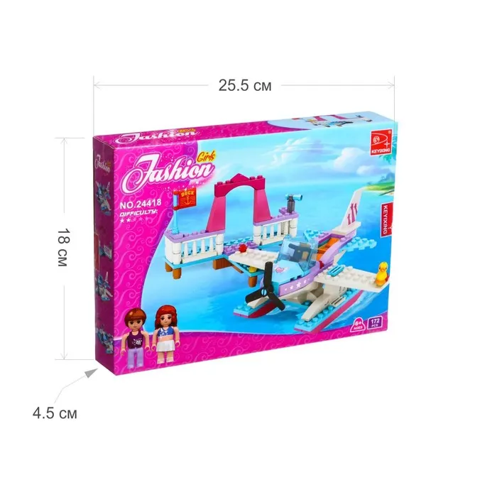Набор содержит 161 деталь и позволяет сконструировать самолёт, причал и две мини-фигурки. Разнообразные элементы пробудят фантазию юной леди: она придумает множество захватывающих сюжетов и невероятно весело проведёт время.