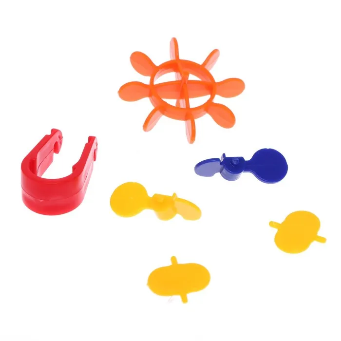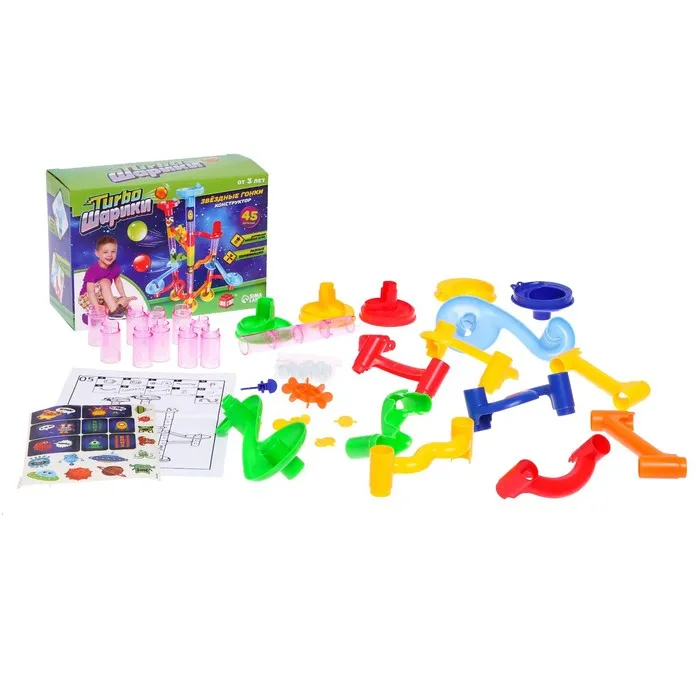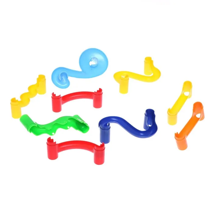 Набор состоит из прозрачных трубочек, разноцветных мостиков, извилистых дорожек и мельниц.