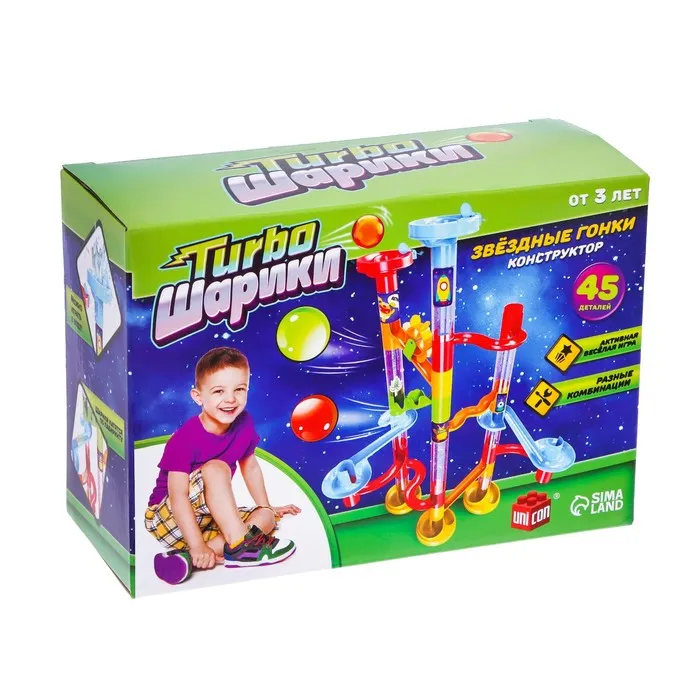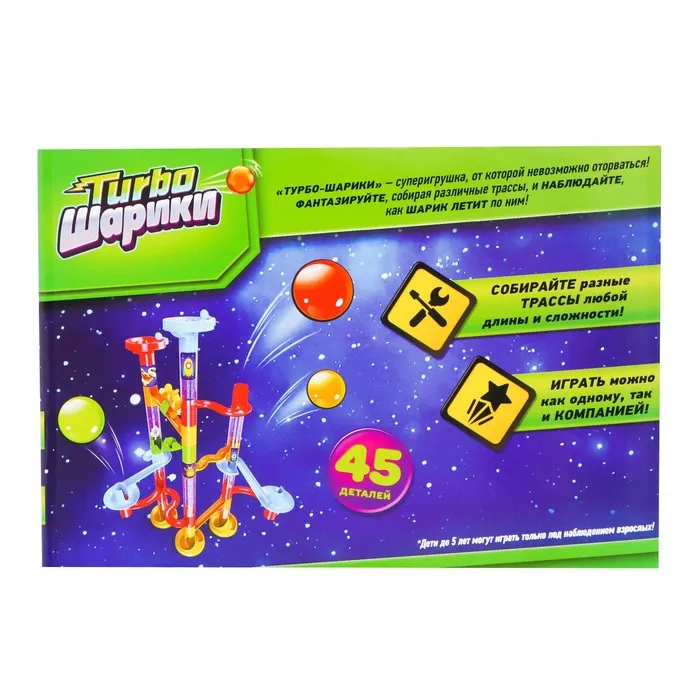«Турбошарики» — увлекательная игра, с которой ребёнок сконструирует разнообразные лабиринты и устроит звёздные гонки с друзьями. С забавными монстриками соревноваться будет ещё увлекательней. Малыш расставит картонных персонажей, как кегли для боулинга, а затем попытается сбить их мячиками.