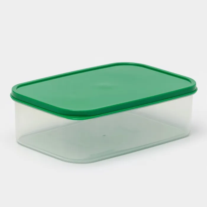 Прозрачный контейнер 1,2 л — вместительное решение для хранения крупных порций: супа, гарнира, запеканки или приготовленных овощей. Прямоугольная форма экономит пространство в холодильнике, а зелёная крышка делает его легко узнаваемым среди других.