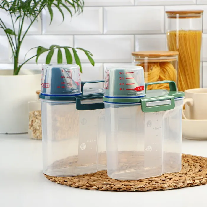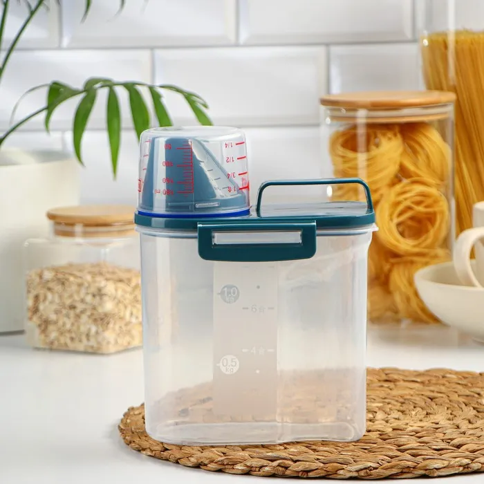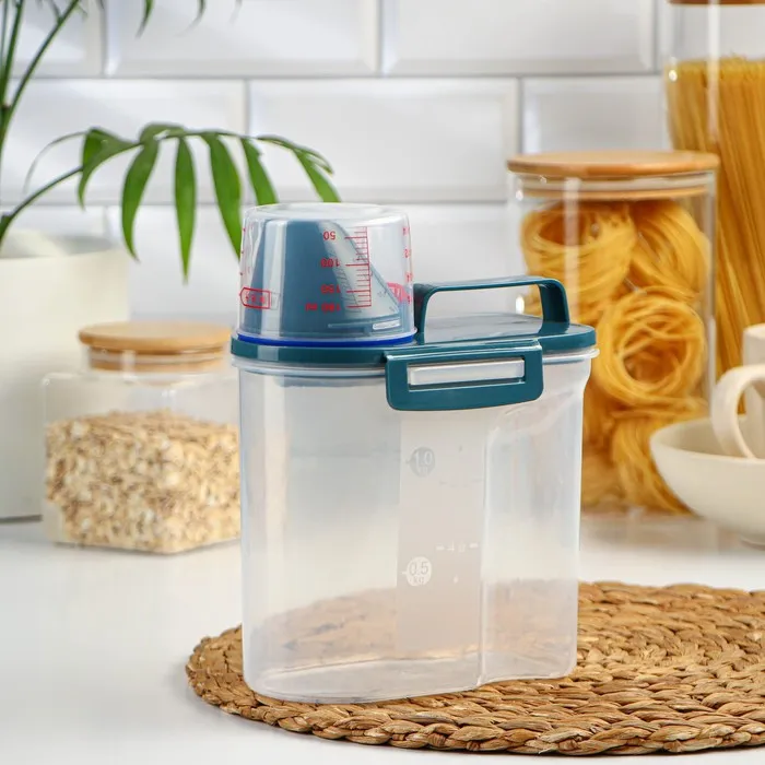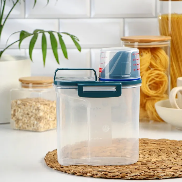 Чем уютнее и комфортнее вам на кухне, тем вкуснее получаются блюда. Организация пространства состоит из мелочей, например, красивый и удобный контейнер, который наведёт порядок на ваших полках. Контейнер изготовлен из прочного пищевого пластика. Изделие продумано до мелочей: широкое горлышко-дозатор, мерный стаканчик, мерная шкала на стенке контейнера, широкая ручка для переноса, защёлки и силиконовые вставки для герметичности. Ёмкость сохранит ваши запасы от влаги и попадания внешнего мусора и неприятных запахов.