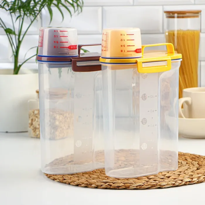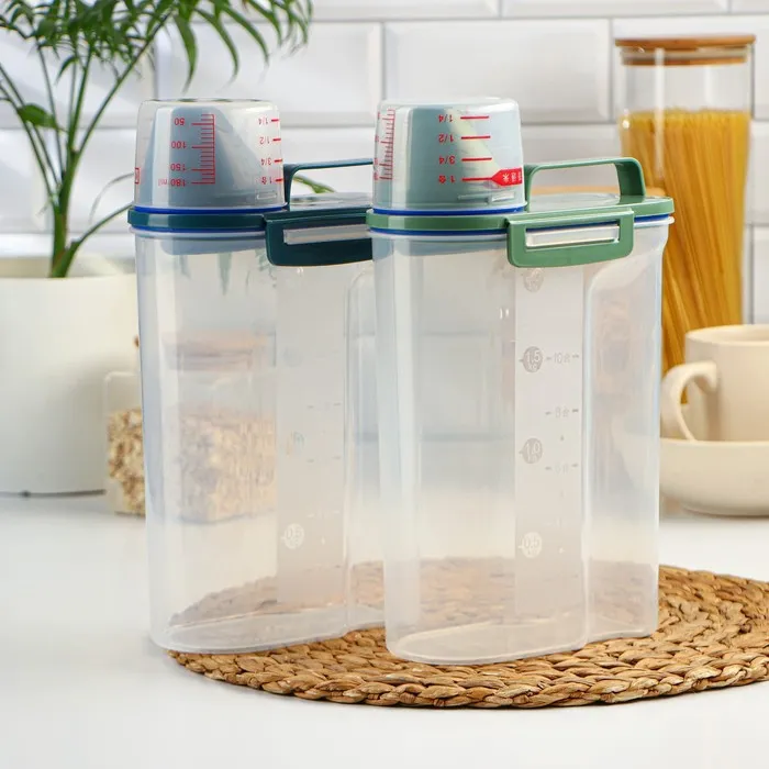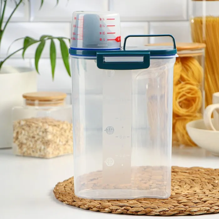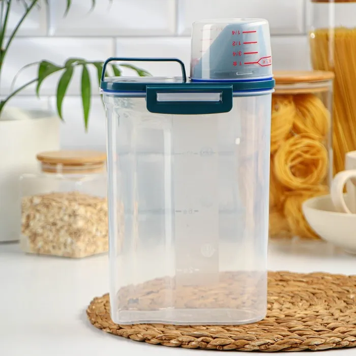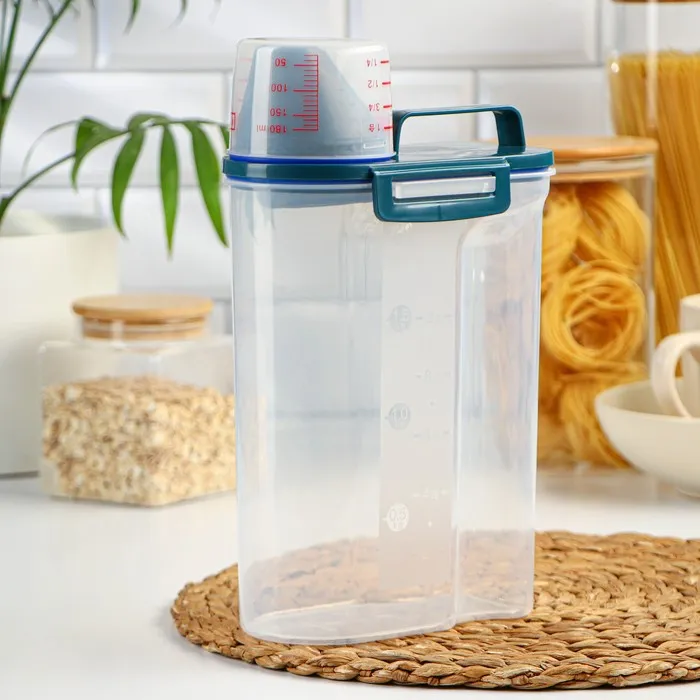 А вы знали, что чем уютнее и комфортнее вам на кухне, тем вкуснее получаются блюда. Организация пространства состоит из мелочей, например, красивый и удобный контейнер, который наведёт порядок на ваших полках. Контейнер изготовлен из прочного пищевого пластика. Изделие продумано до мелочей: широкое горлышко-дозатор, мерный стаканчик, мерная шкала на стенке контейнера, широкая ручка для переноса, защёлки и силиконовые вставки для герметичности. Ёмкость сохранит ваши запасы от влаги и попадания внешнего мусора и неприятных запахов.