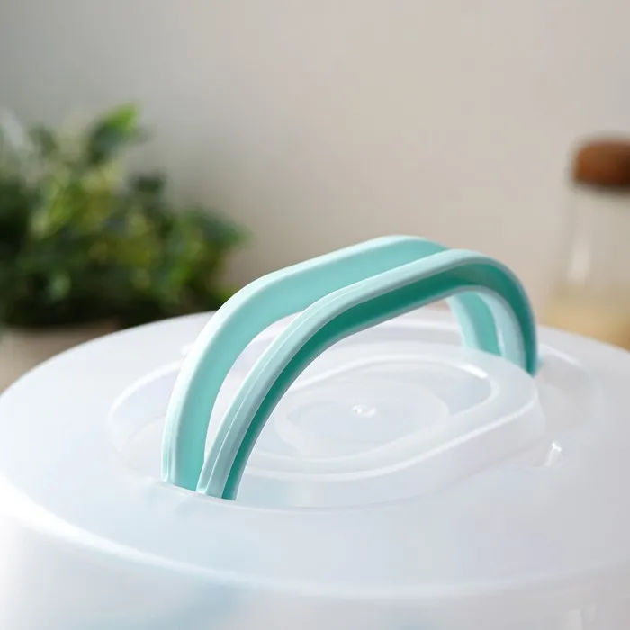 - Сверху имеется удобная ручка, которая при необходимости вытягивается - это позволяет комфортно переносить содержимое тортовницы.