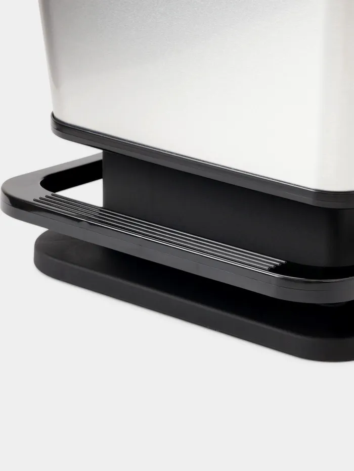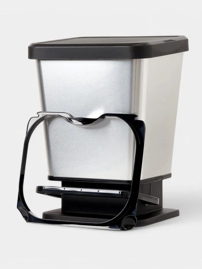 - Удобство в эксплуатации благодаря практичной педали, позволяющей открывать и закрывать крышку без необходимости использовать руки. Специальная рамка под крышкой урны фиксирует и удерживает мешок на месте.