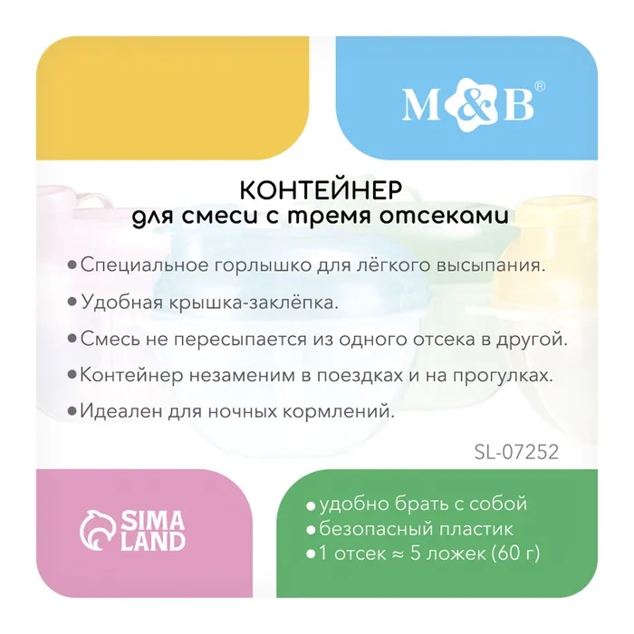 Контейнер спроектирован для быстрого и удобного использования. Он легко помещается в сумку или карман коляски, что делает его идеальным выбором для прогулок и путешествий. Упрощает дозирование смеси и поддерживает чистоту вокруг во время кормления.