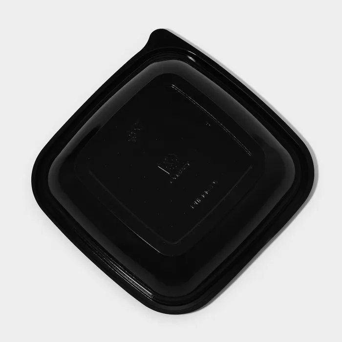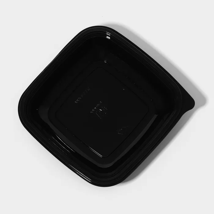 Черный квадратный контейнер для пищевых продуктов, идеально подходящий для хранения и транспортировки. Размер 16х16х3,6 см позволяет удобно размещать порционные блюда, закуски и другие продукты.