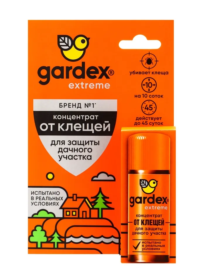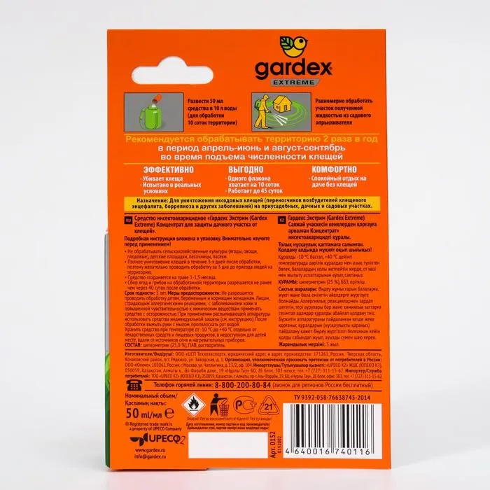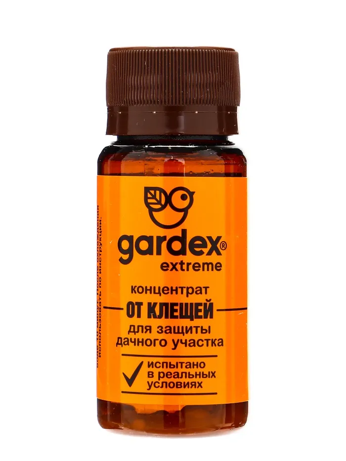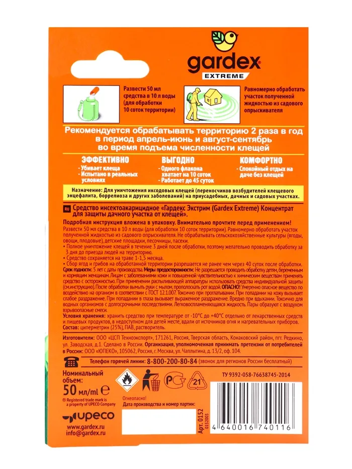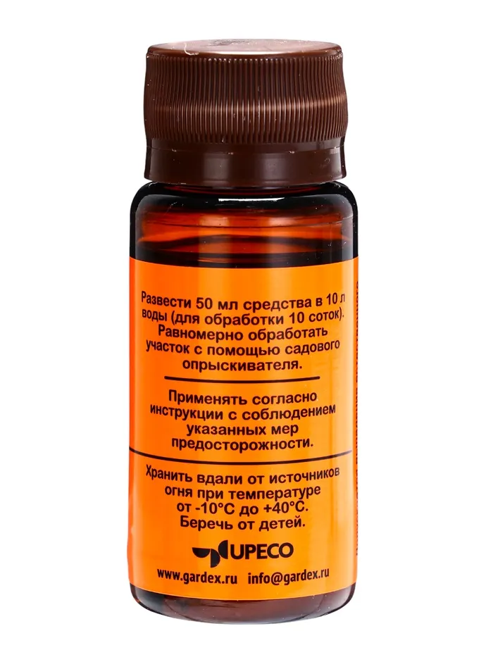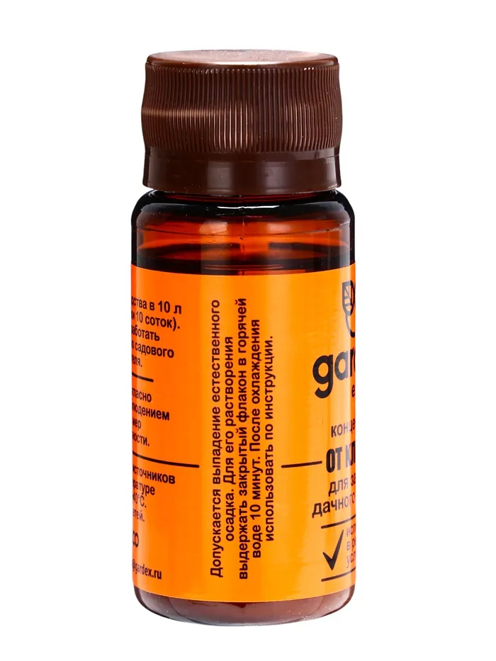 Описание: убивает клещей. Испытано в реальных условиях. Один пузырек для обработки 10 соток. Одного применения хватает на 45 соток.