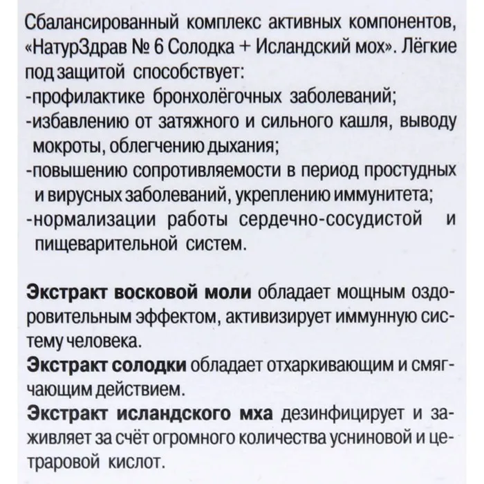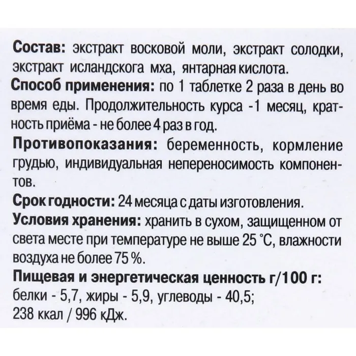 Состав: экстракт восковой моли, экстракт солодки, экстракт исландскога мха, янтарная кислота.