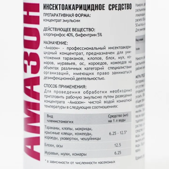 Средство инсектоакарицидное Амазон предназначено для уничтожения синантропных членистоногих (тараканов, постельных клопов, блох, кожеедов, рыжих домовых муравьев, домовых сверчков, чешуйниц, крысиных клещей).