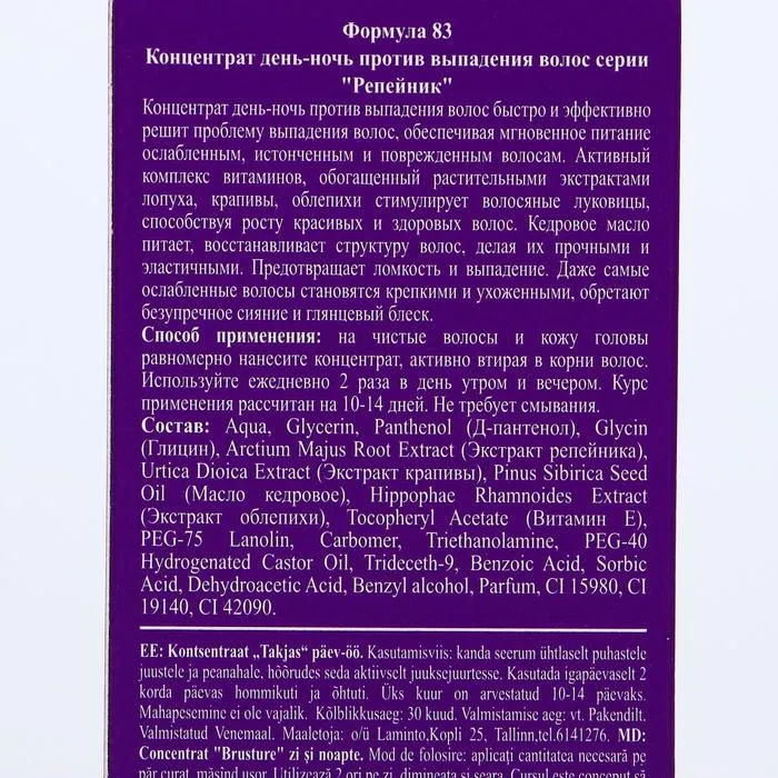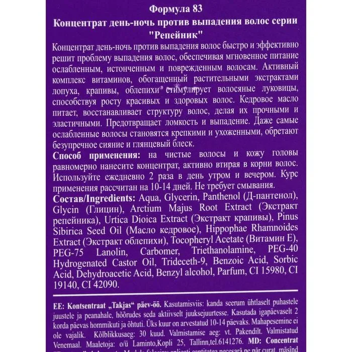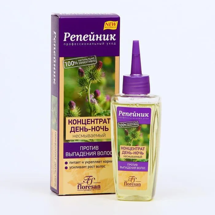 Концентрат «Репейник» представляет собой физиологический раствор в гелевой смягчающей формуле. Предназначен для профилактики и уменьшения чрезмерного выпадения волос, способствует стимулированию их роста и оздоровлению кожи головы. Активный комплекс из экстракта крапивы и масла репейника укрепляет корни волос и восстанавливает их функцию. При регулярном применении происходит активация роста волос, что способствует уменьшению их выпадения. Рекомендуется сочетать с шампунем и маской-кондиционером серии «Репейник».