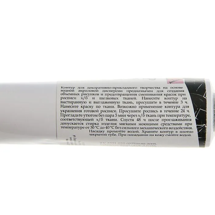 Контуры для декоративно-прикладного творчества на основе водной акриловой дисперсии предназначены для создания объемных рисунков и предотвращения смешивания красок при росписи х/б и шелковых тканей.
