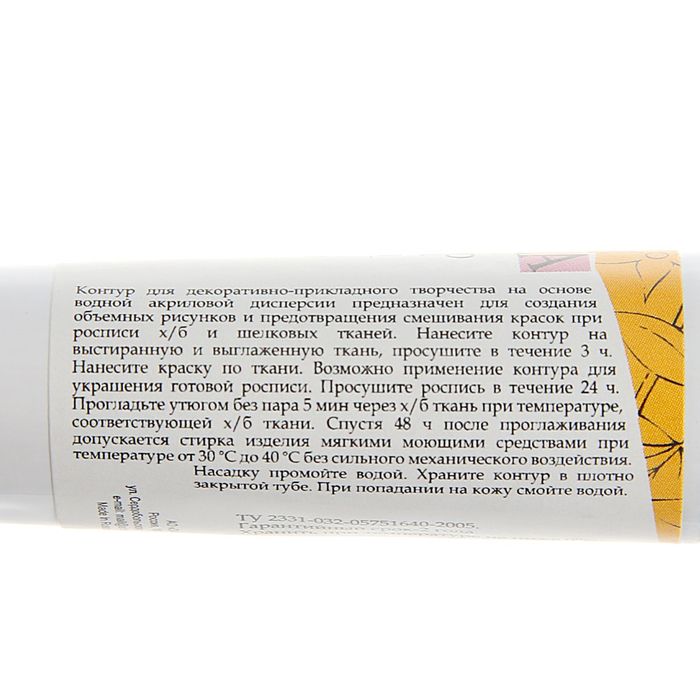 Контуры для декоративно-прикладного творчества на основе водной акриловой дисперсии предназначены для создания объемных рисунков и предотвращения смешивания красок при росписи х/б и шелковых тканей.