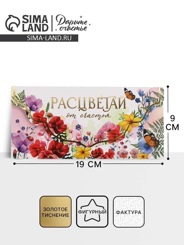 Конверт для денег «Расцветай», акварельный картон, тиснение, конгрев 19 х 9 см