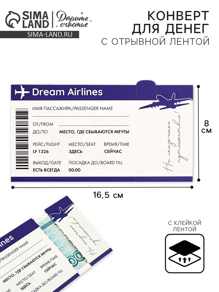 Конверт для денег с отрывной лентой «Авиабилет», 16.5 х 8 см