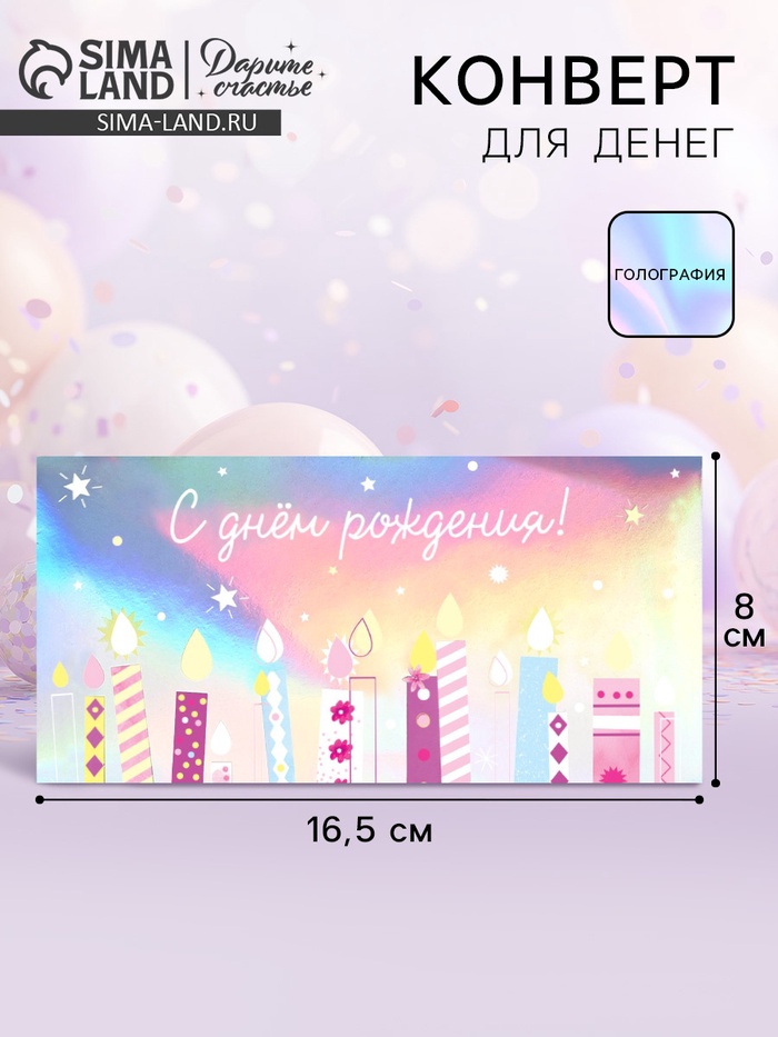 Конверт для денег «С днём рождения», голография, торт, 16.5×8 см