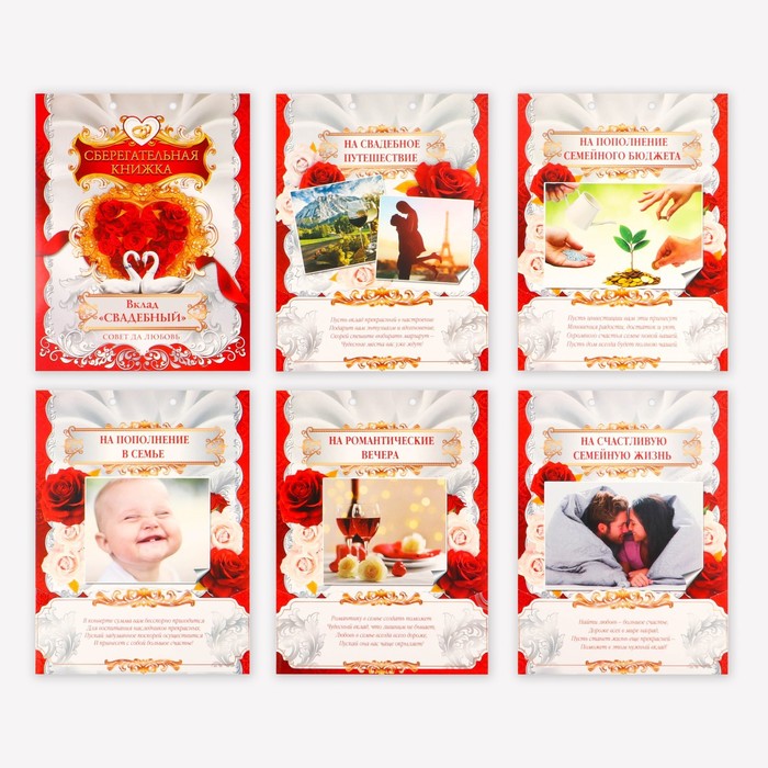 Оригинальная идея для денежного подарка. В этой яркой открытке-сберкнижке - 6 страниц с 5 встроенными карманами для денег, куда необходимо положить выбранную вами сумму. Страницы украшают добрые советы, на что можно потратить денежный подарок.Такой необычный презент позволяет создать целую историю и подарить предвкушение удивительных и чудесных моментов, которые ждут молодоженов впереди. Книга идеальна в качестве как коллективного, так и индивидуального поздравления. В коллекции представлены сберегательные книжки для разных торжественных событий: свадьба, юбилей, день рождения.