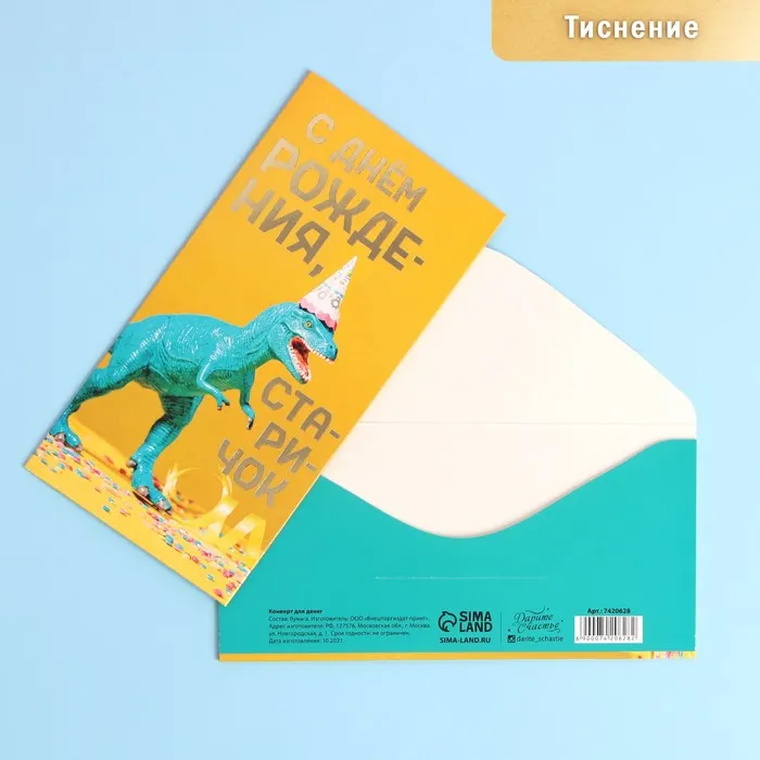 Конверт для денег «С Днем Рождения, старичок», динозавр, тиснение, 16,5 × 8 см — Характеристики