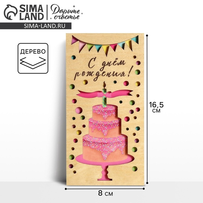 Конверт для денег с деревянным элементом «С Днём Рождения» торт, 16.5×8 см