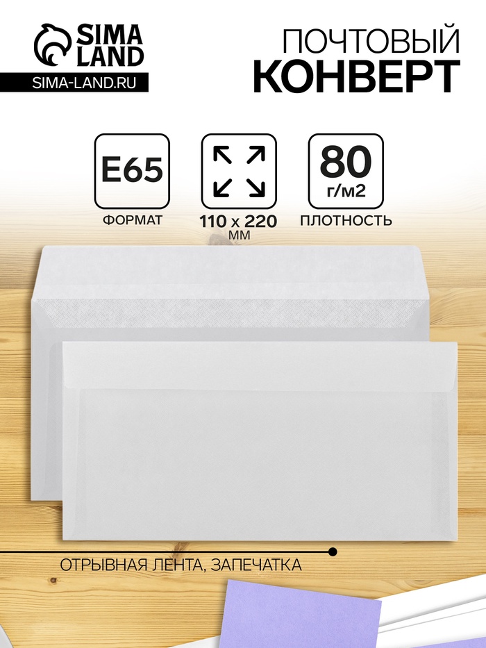 Конверт почтовый Е65 110 x 220 мм, без подсказа, без окна, отрывная лента, внутренняя запечатка, 80 г/м2 — Характеристики