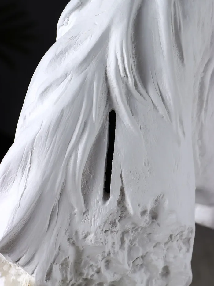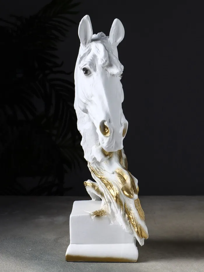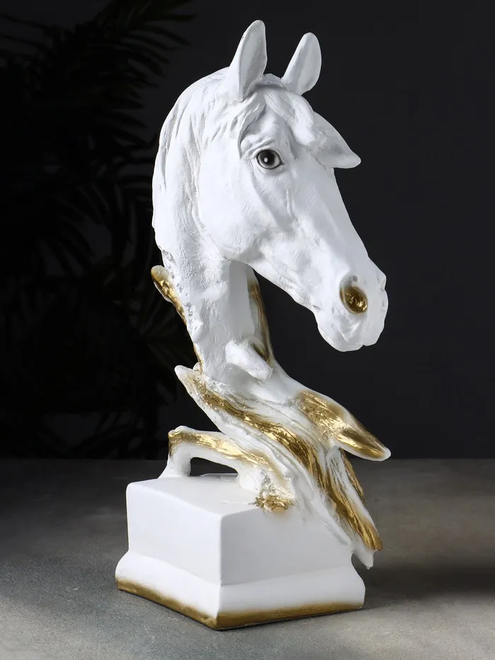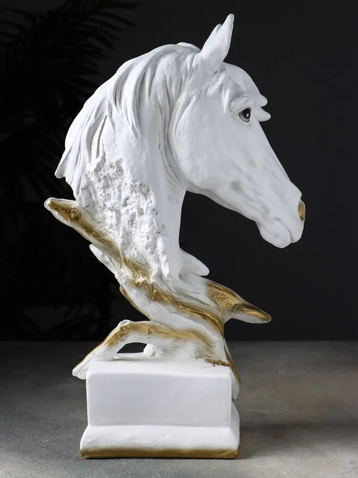 Образ лошади, известный своей силой и благородством, воплощён в форме копилки, где каждая деталь подчёркивает эстетику движения и внутреннюю мощь. Бюст выполнен из прочного гипса и оформлен в бело-золотистой палитре — сочетание оттенков создаёт эффект старинной скульптуры, наполненной светом и достоинством. Размеры 14×23×41 см обеспечивают удобство размещения на полке, рабочем столе или каминной доске без потери художественной выразительности.