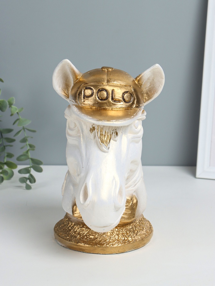 - Выразительный дизайн: Фигура коня в модной кепке — это забавный и трендовый образ. Сочетание матового белого гипса и изящного золотого покрытия создаёт эффект дорогого декора. Копилка оживит пространство на полке или рабочем столе.