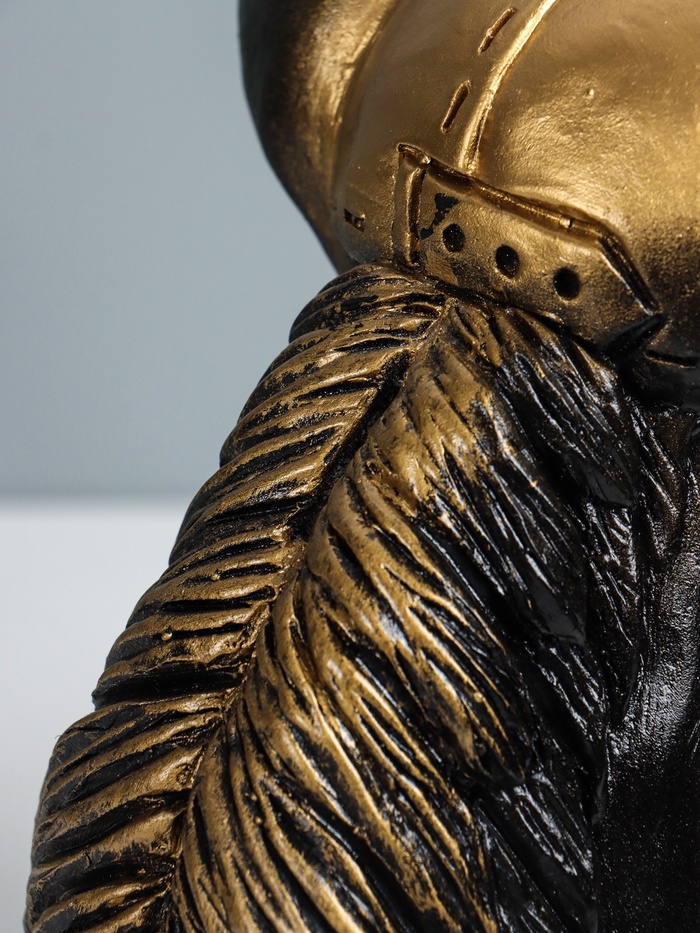 - Выразительный дизайн: Чёрный матовый фон с контрастным золотым покрытием создаёт эффект дорогой статуэтки. Необычная деталь — кепка — придаёт образу индивидуальность и современный шарм.