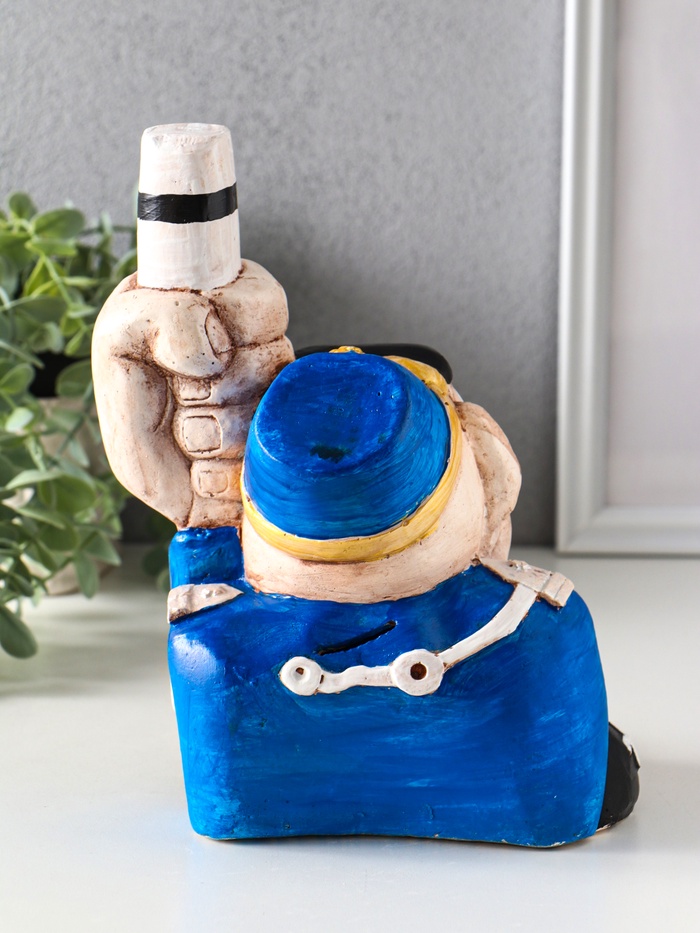 - Узнаваемый образ: Фигурка гаишника в фирменной форме и фуражке передана с детальной точностью. Яркий окрас подчеркивает детали образа, делая копилку живой и выразительной.