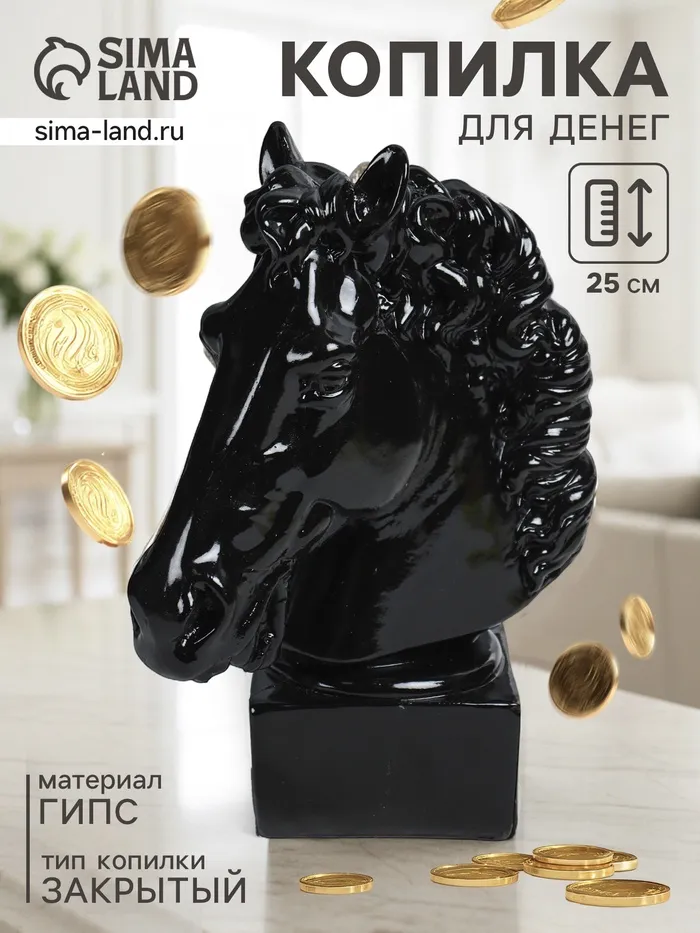 Представляем вашему вниманию уникальный предмет, который сочетает в себе функциональность и элегантность — копилку в виде головы благородного коня. Её чёрный цвет подчёркивает силу и загадочность образа, а тщательно продуманный дизайн делает её не просто аксессуаром для хранения денег, но и стильным элементом интерьера.