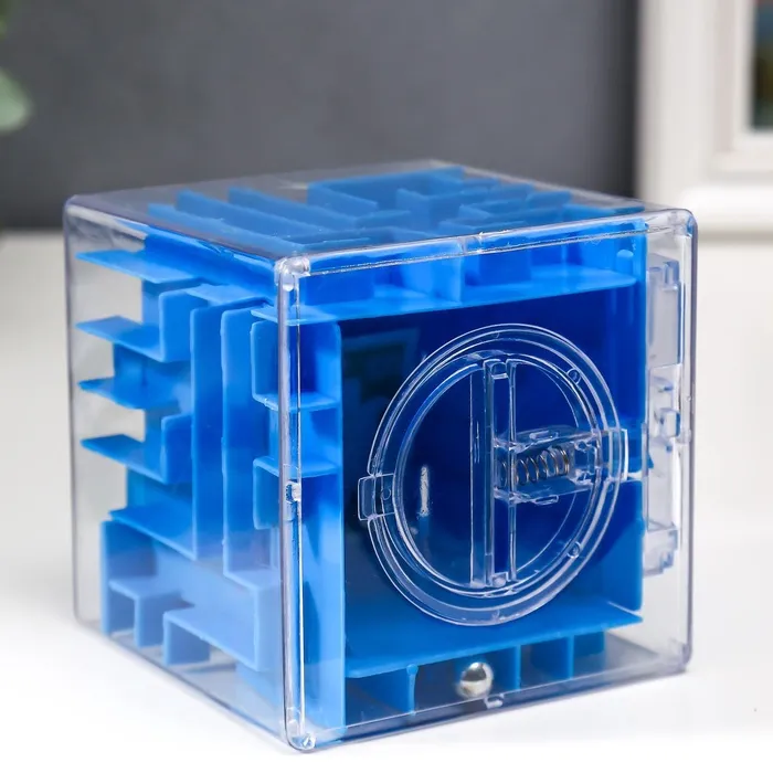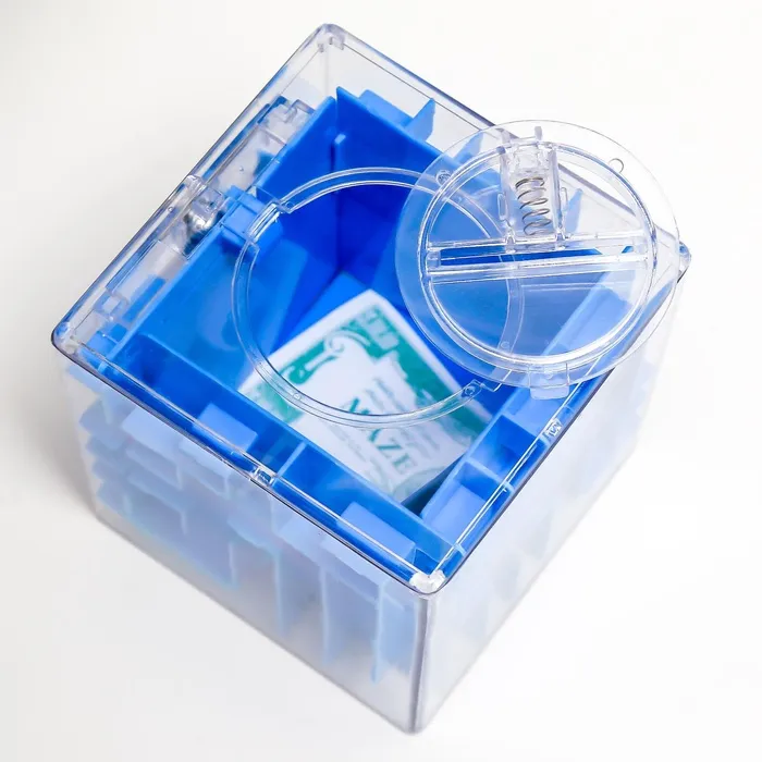 Копилка выполнена в виде прозрачного пластикового куба. Центральная ячейка, в которой и хранятся монеты, окружена лабиринтом с шариком. Для того чтобы копилка открылась, необходимо провести шарик по лабиринту к пружинке, которая открывает крышку копилки.