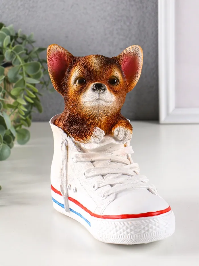 Эта копилка в виде кедика с очаровательным щенком чихуахуа — не просто функциональный предмет, а оригинальный элемент декора, который привнесёт тепло и уют в любой интерьер. Изготовленная из прочного полистоуна и покрытая качественной краской, она сочетает в себе надёжность и привлекательный внешний вид.