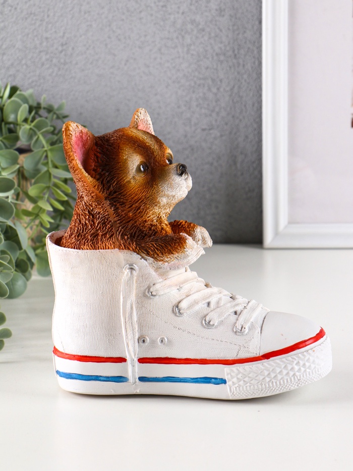 Эта копилка в виде кедика с очаровательным щенком чихуахуа — не просто функциональный предмет, а оригинальный элемент декора, который привнесёт тепло и уют в любой интерьер. Изготовленная из прочного полистоуна и покрытая качественной краской, она сочетает в себе надёжность и привлекательный внешний вид.