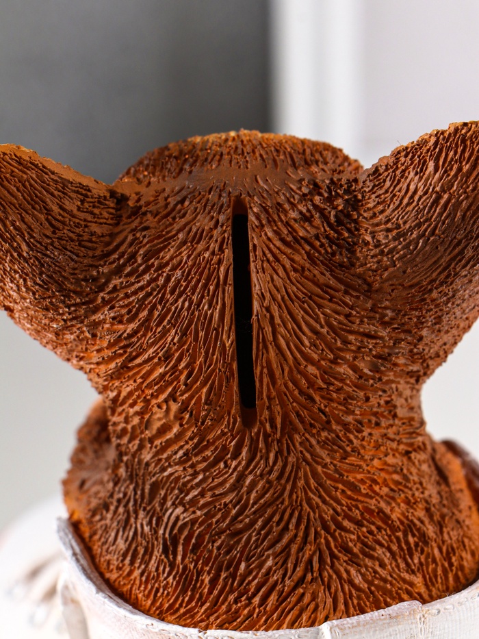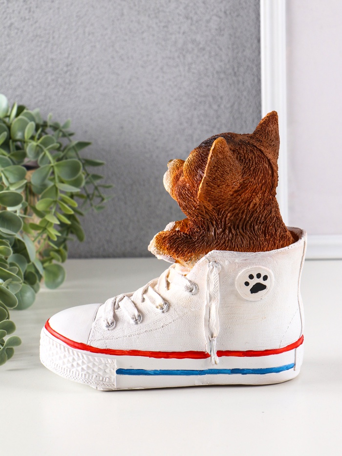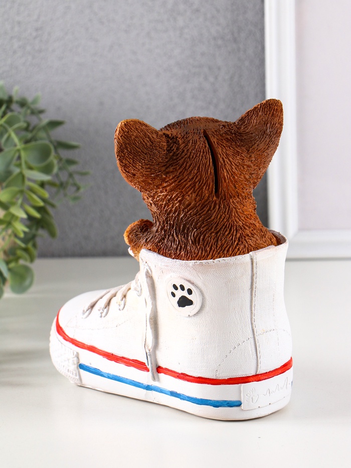 Закрытый тип копилки обеспечивает безопасность накоплений, а компактные размеры 17×18×9 см позволяют разместить её на полке, рабочем столе или в детской комнате. Мастерски выполненная детализация щенка и обуви создаёт живой и дружелюбный образ, который станет отличным подарком для любителей собак и коллекционеров.