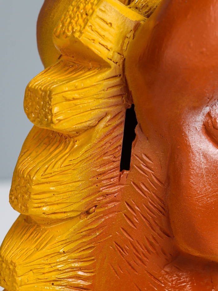 - Солидный вид: Копилка отлита из гипса, что придает ей приятную тяжесть и ощущение ценности. Фактурная поверхность и детализация подчеркивают ремесленный подход к созданию. Это не массовый пластик, а уникальный предмет с характером.