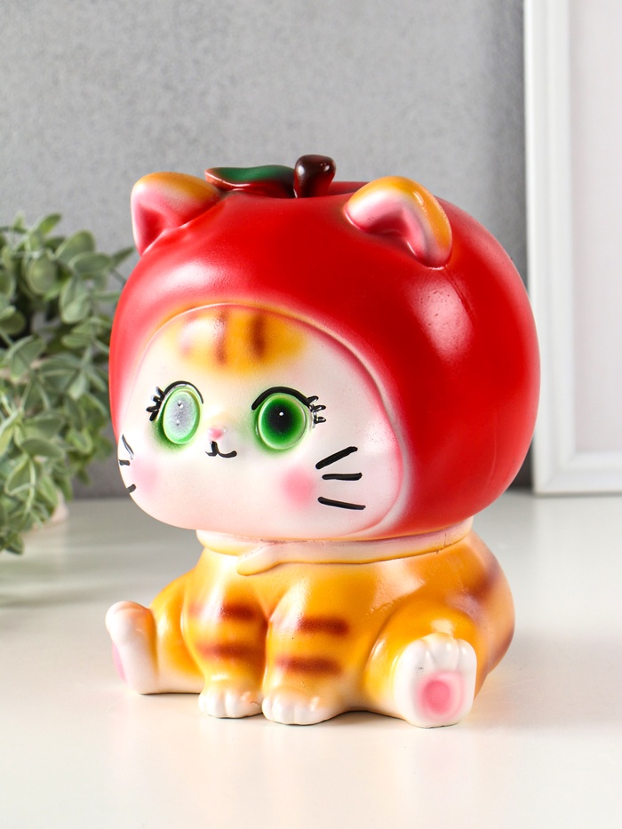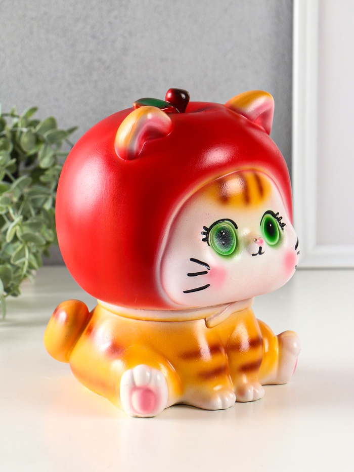 Этот яркий кот-копилка станет верным помощником в накоплении средств и украсит интерьер. Фигурка полосатого кота в яблочном костюме выполнена из гипса и с детализированным окрасом, что делает каждый экземпляр уникальным.