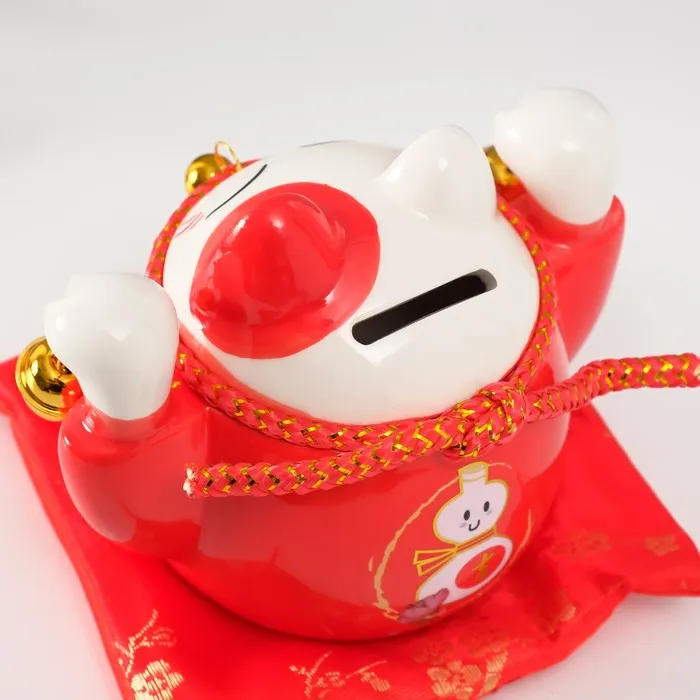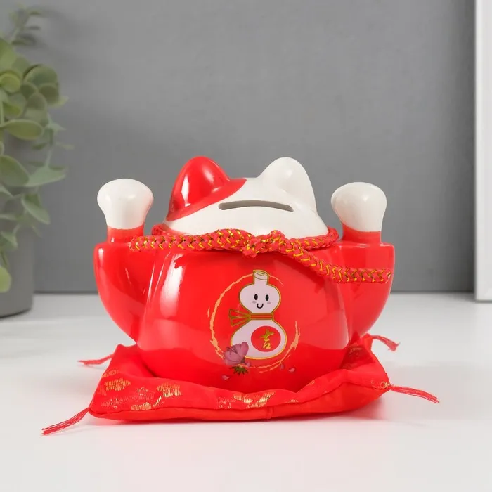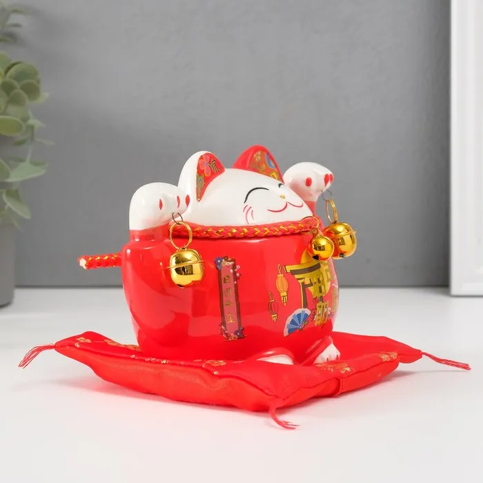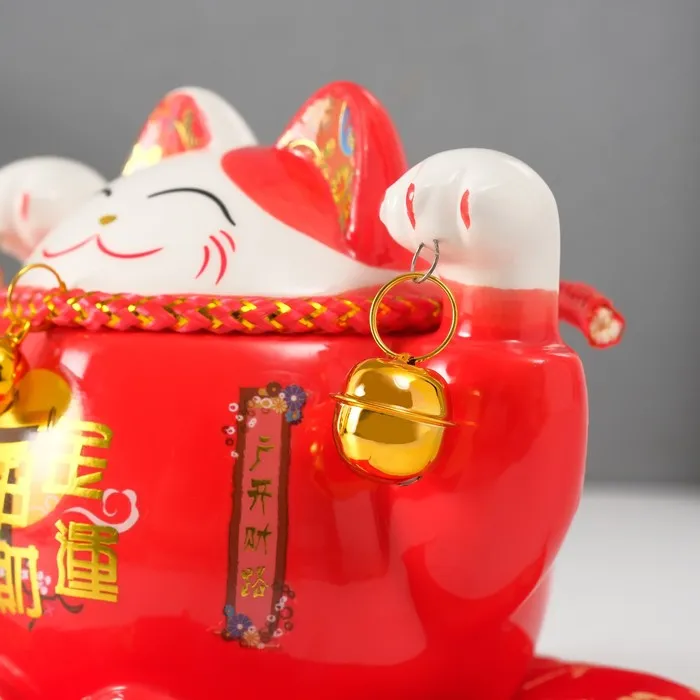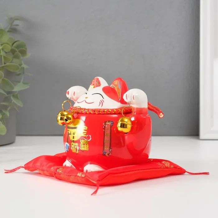 Копилка керамика "Кот манэки-нэко красный с колокольчиками" 10,5х13,5х9 см — Характеристики