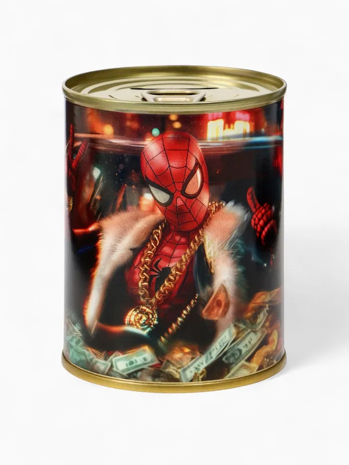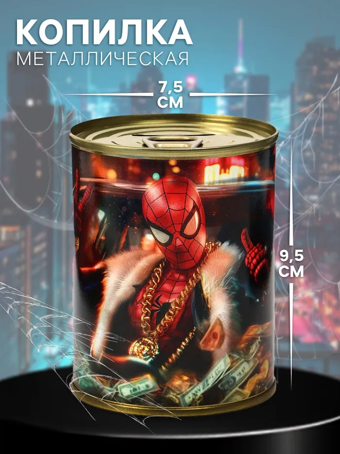 Металлическая копилка в форме банки с принтом «Человек-паук» — 9,5×7,5×7,5 см. Прочный корпус и удобное отверстие для монет. Идеальный подарок для поклонников супергероев. Помогает копить деньги с пользой и вдохновляет на подвиги каждый день!
