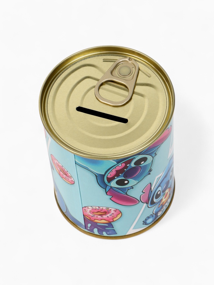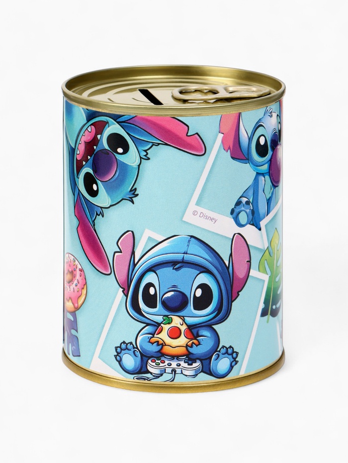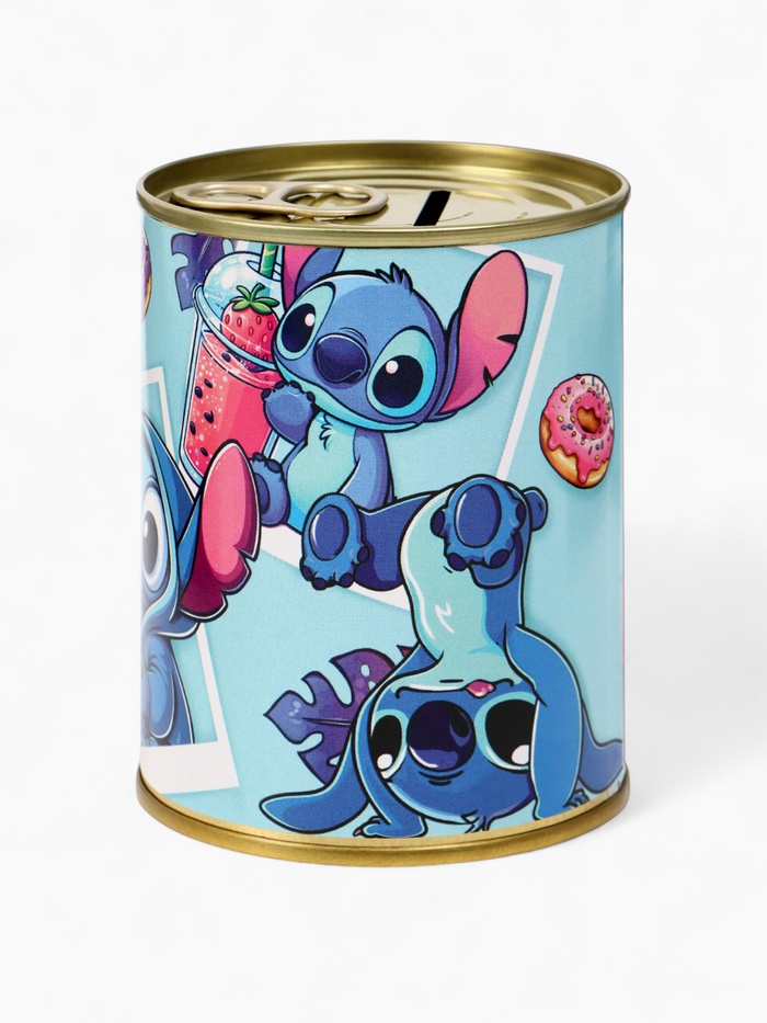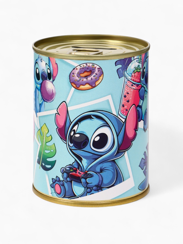 Копилка металлическая в виде банки с принтом Стича — 9,5×7,5×7,5 см. Яркий дизайн, прочный корпус и удобное отверстие для монет. Идея для подарка детям и фанатам Disney. Копи с улыбкой вместе с любимым инопланетянином!