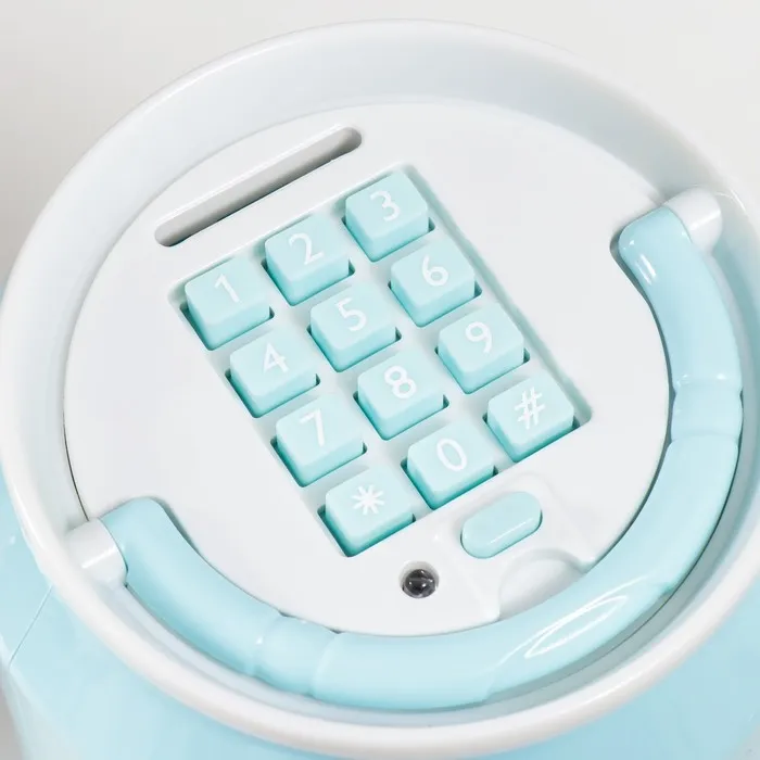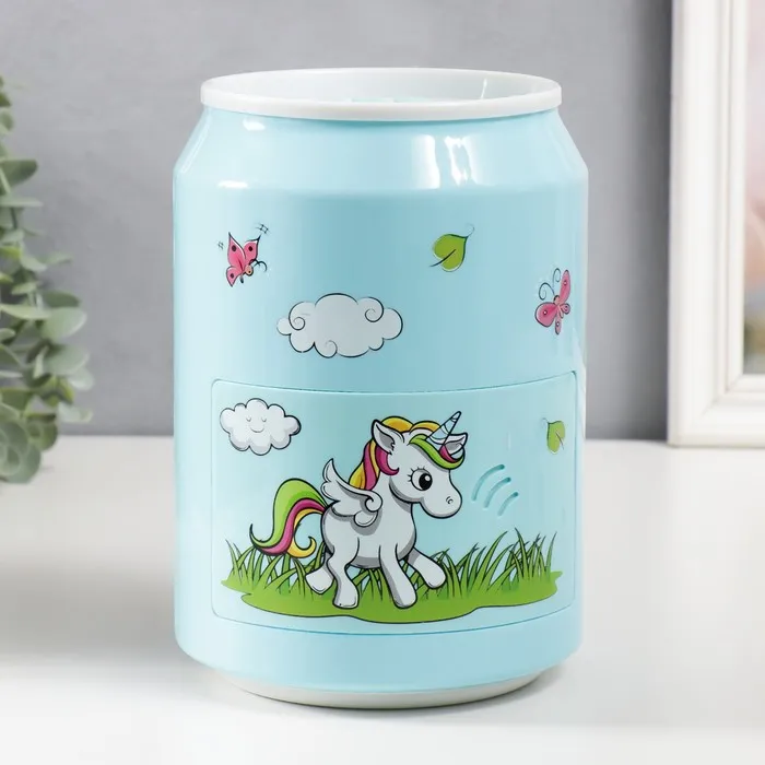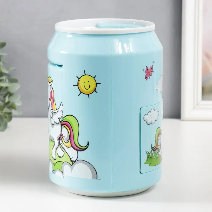 Копилка пластик "Банка. Единорожка" кодовый замок, звук АА голубой 15х21 см — Характеристики