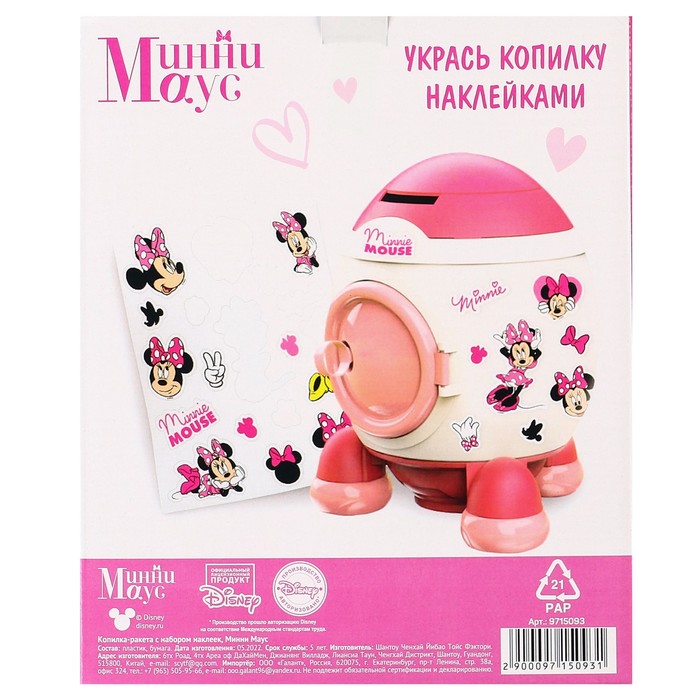 Копилка ракета с набором наклеек, 22.5 см × 18.5 см × 17.5 см «Мышка», Минни Маус — Характеристики