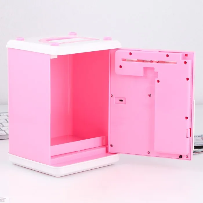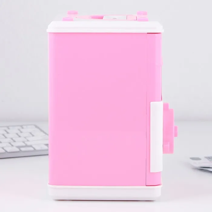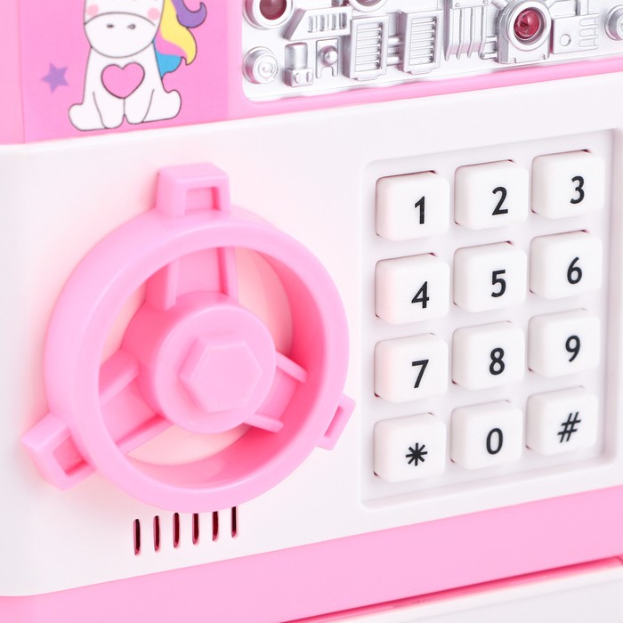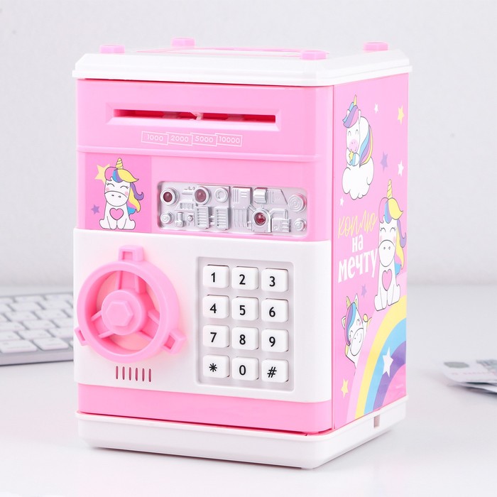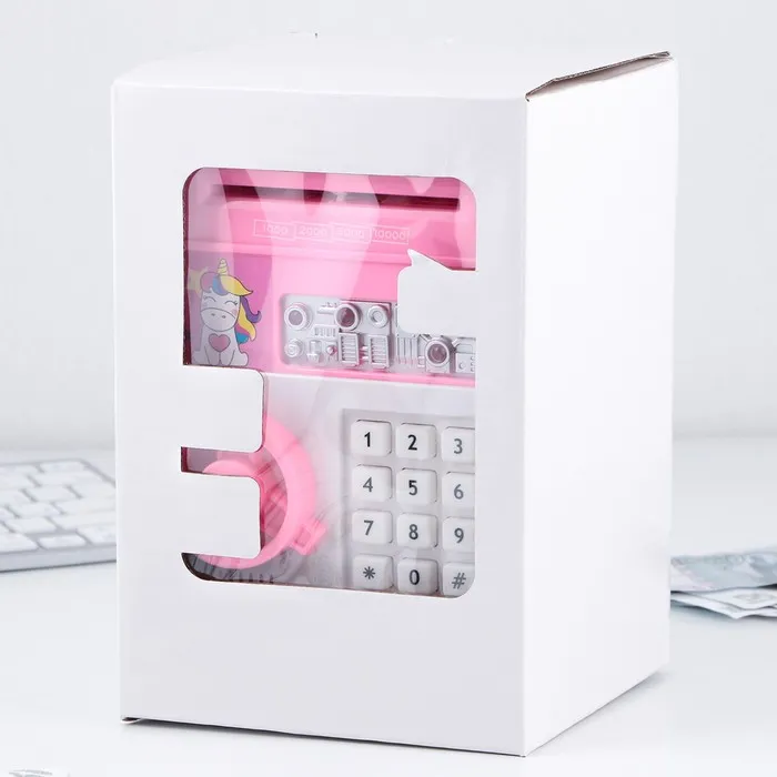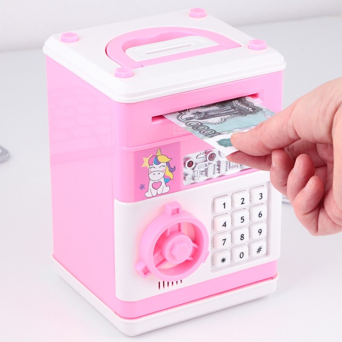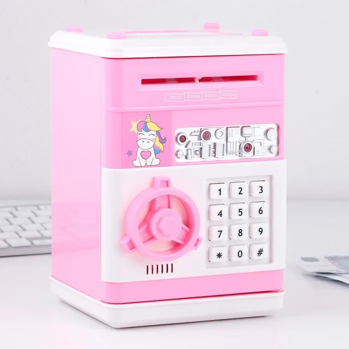 Электронная копилка-сейф для денег работает от батареек, принимает монеты и бумажные купюры. Уникальная музыкальная копилка - это копия сейфа с кодовым замком и электронным купюроприемником, как в банкомате, можно закидывать монеты или же вставлять купюры. Открыть может только человек, который знает пин-код сейфа. Имеет музыкальное сопровождение. По умолчанию в копилке установлен ПИН код: "0000". Для смены ПИН кода необходимо открыть дверцу вводом кода 0000, дождаться, пока светодиод погаснет, потом нажать и удерживать кнопку * 10 секунд, далее ввести новый 4-значный код и нажать #, после чего отпустить кнопку *. Нужно сразу проверить, открывается ли копилка-сейф с новым кодом.Если купюры плохо входят или электронный замок не работает, нужно поменять батарейки, желательно использовать батарейки высокого качества (3 батарейки типа АА).