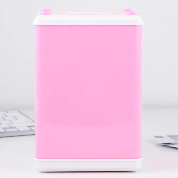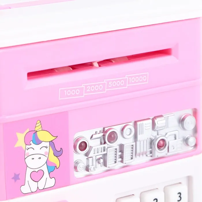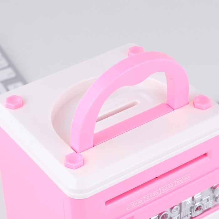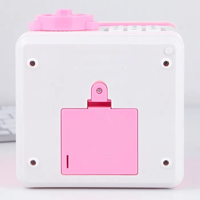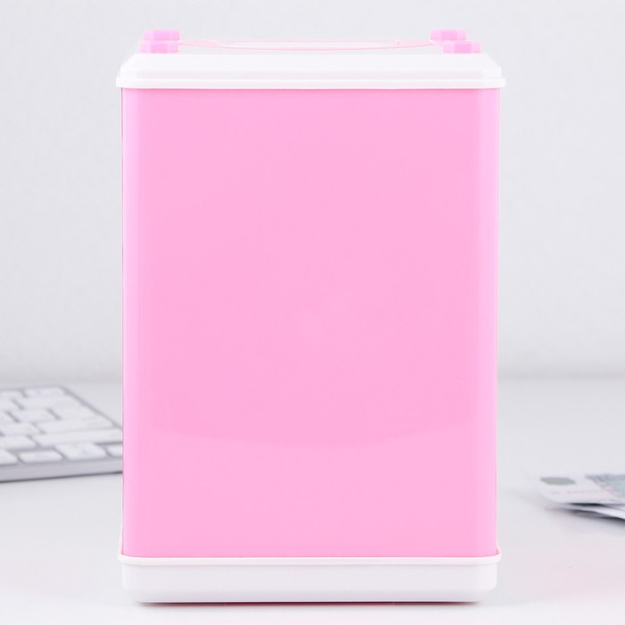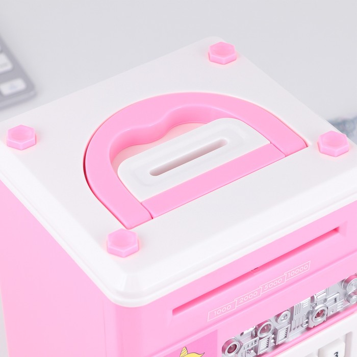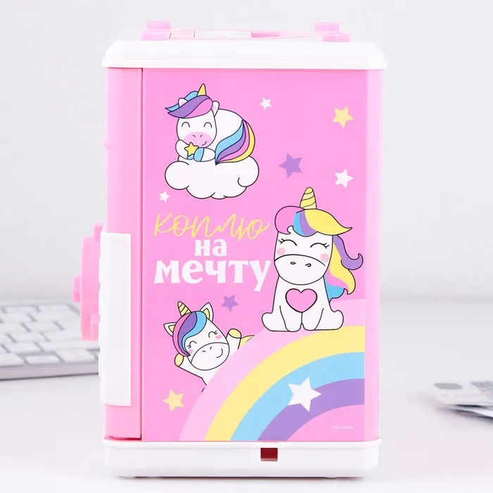Электронная копилка-сейф для денег работает от батареек, принимает монеты и бумажные купюры. Уникальная музыкальная копилка - это копия сейфа с кодовым замком и электронным купюроприемником, как в банкомате, можно закидывать монеты или же вставлять купюры. Открыть может только человек, который знает пин-код сейфа. Имеет музыкальное сопровождение. По умолчанию в копилке установлен ПИН код: "0000". Для смены ПИН кода необходимо открыть дверцу вводом кода 0000, дождаться, пока светодиод погаснет, потом нажать и удерживать кнопку * 10 секунд, далее ввести новый 4-значный код и нажать #, после чего отпустить кнопку *. Нужно сразу проверить, открывается ли копилка-сейф с новым кодом.Если купюры плохо входят или электронный замок не работает, нужно поменять батарейки, желательно использовать батарейки высокого качества (3 батарейки типа АА).