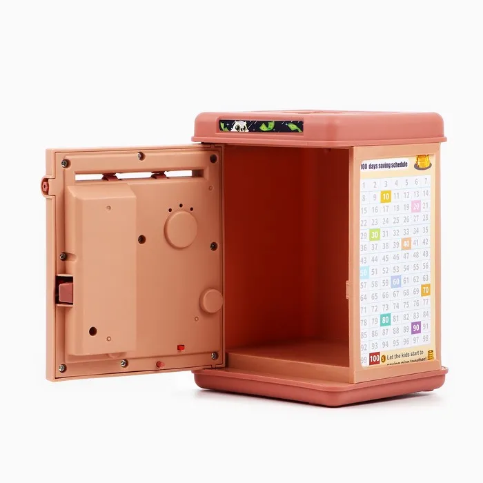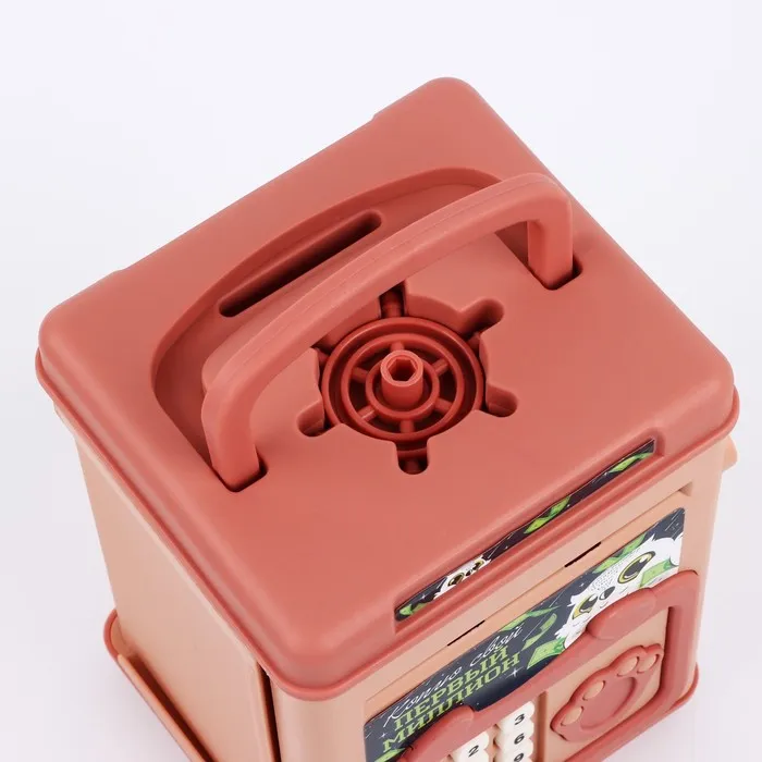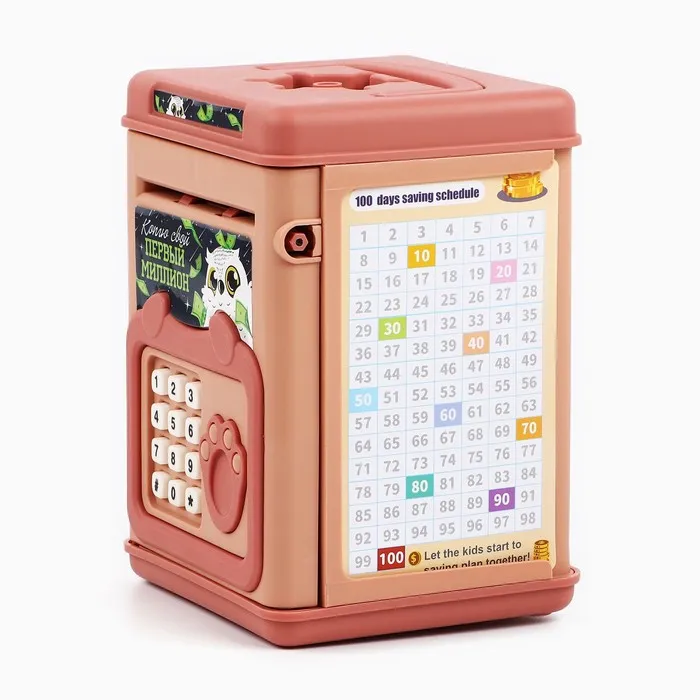 Электронная копилка-сейф для денег работает от батареек, принимает монеты и бумажные купюры. Уникальная музыкальная копилка - это копия сейфа с кодовым замком и электронным купюроприемником, как в банкомате, можно закидывать монеты или же вставлять купюры. Открыть может только человек, который знает пин-код сейфа. Имеет музыкальное сопровождение. По умолчанию в копилке установлен ПИН код: "0000". Для смены ПИН кода необходимо открыть дверцу вводом кода 0000, дождаться, пока светодиод погаснет, потом нажать и удерживать кнопку * 10 секунд, далее ввести новый 4-значный код и нажать #, после чего отпустить кнопку *. Нужно сразу проверить, открывается ли копилка-сейф с новым кодом.Если купюры плохо входят или электронный замок не работает, нужно поменять батарейки, желательно использовать батарейки высокого качества (3 батарейки типа АА).