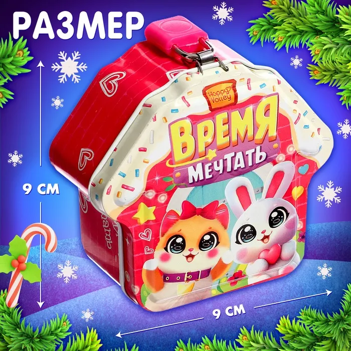«Время мечтать» — это необычный сюрприз в металлической коробочке, которую можно использовать как шкатулку или копилку. В сюрпризе вам попадётся милый котик и две резинки для волос для маленькой принцессы. Набор хорошо подойдёт в качестве подарка для девочки.