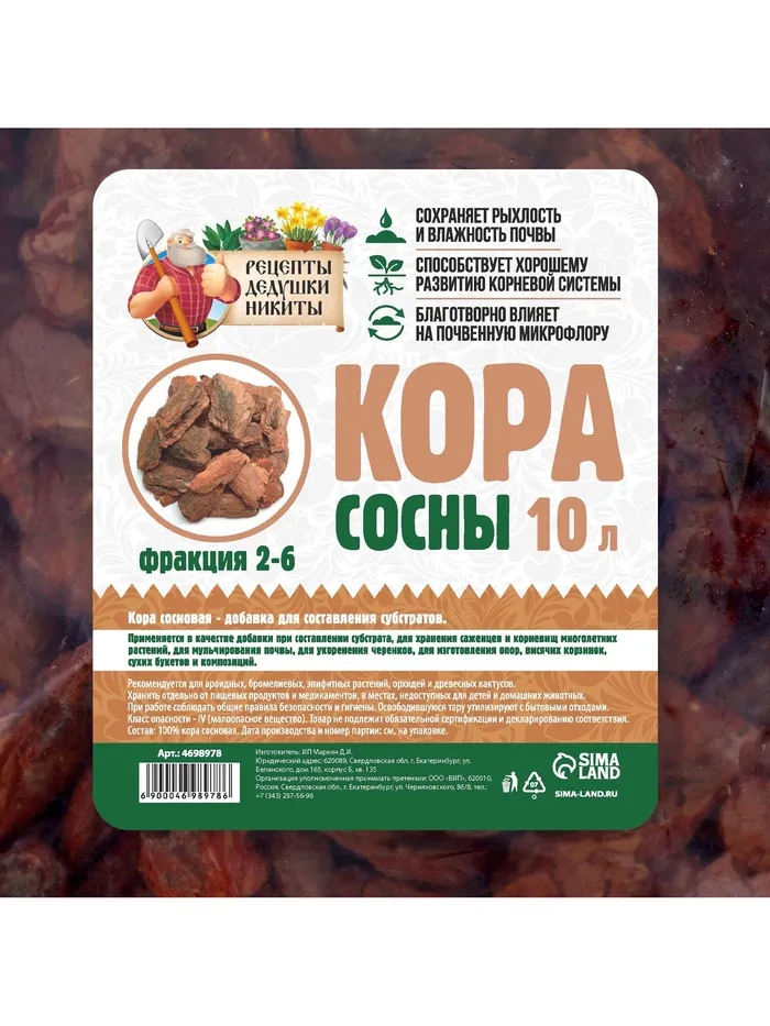 Кора сосны "Рецепты Дедушки Никиты" 10 л фр 2-6 — Характеристики