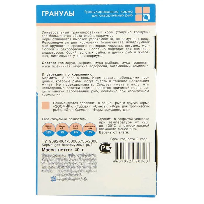Корм для рыб и рептилий ЗООМИР "Гранулы" тонущие гранулы, коробка, 40 г — Характеристики