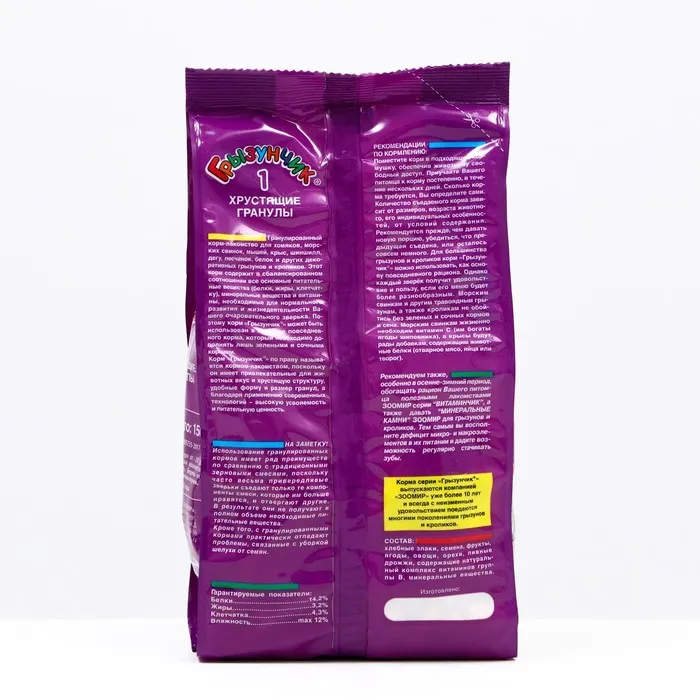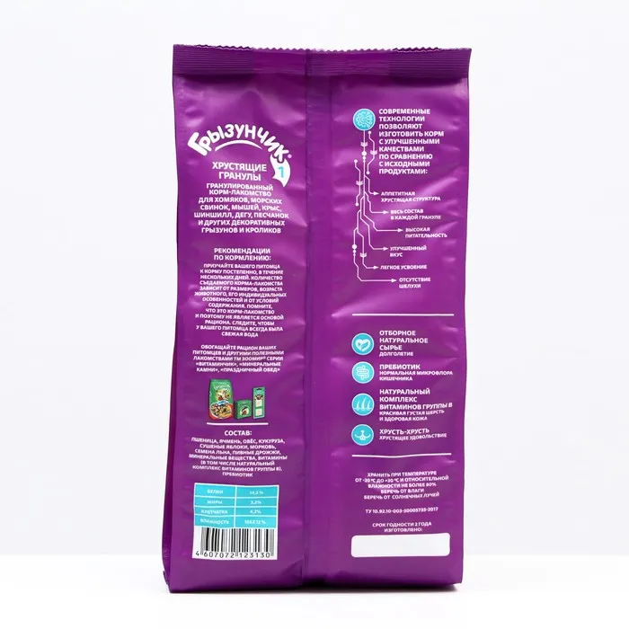 Корм Грызунчик по праву называется кормом-лакомством, поскольку он имеет привлекательные для животного вкус и хрустящую структуру, удобные форму и размер гранул, а благодаря применению современных технологий - высокую усвояемость и питательную ценность.