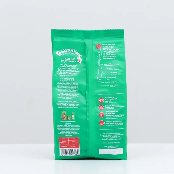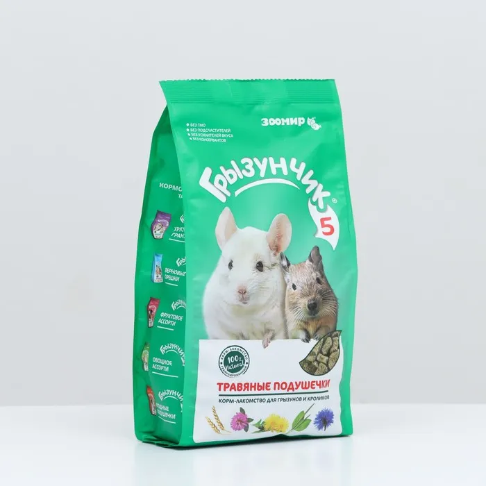 Гранулированный корм-лакомство для декоративных кроликов и травоядных грызунов (морских свинок, шиншилл, дегу и других). Основу корма ГРЫЗУНЧИК 5 - травяные подушечки, в отличие от других кормов серии Грызунчик, составляют луговые травы с высоким содержанием растительных волокон, так необходимых этим животным.